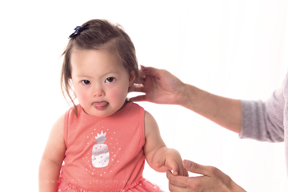 I was so excited to put my hand up for this project! October is World Down Syndrome Awareness Month and I joined a large contingent of photographers from all around Australia in offering our time and skill to take photos of children with Down Syndrome in our area, to be showcased during October. Today my first little model, Grace, joined me in my studio… and this is what happened when I poked my tongue out at her <3